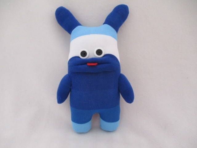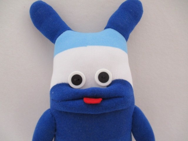 He is created from socks in wide blues stripes with white. His horns are his special feature and he is very proud of them.
