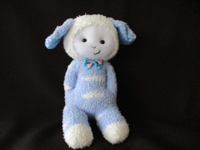 Introducing the CUDDLE BUDDIE, a treasure handmade from the softest, most comforting blue and white socks. The little ears are line with a poly/cotton print fabric. This provides a gentle tactile experience for all little ones. Look how cute the little dicky bow is !