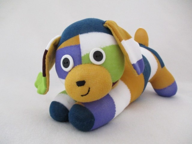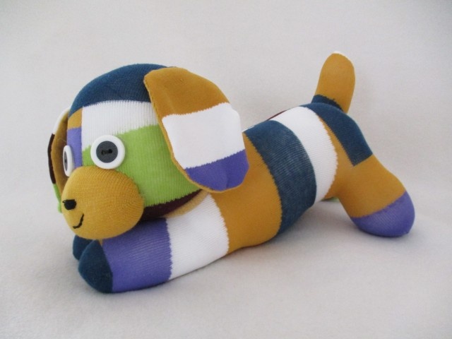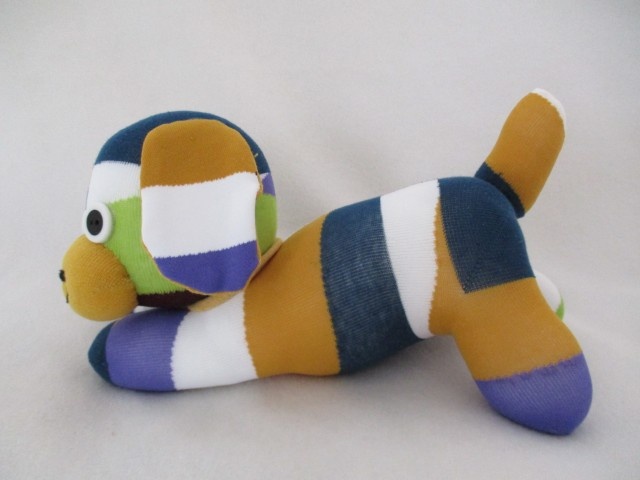 A wonderful handmade soft toy puppy. Made from striking coloured socks that have been transformed into a one-of-a-kind toy.