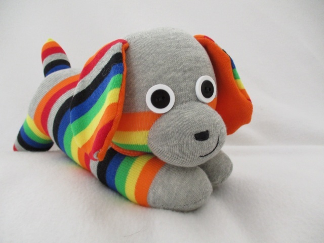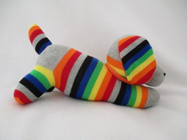 A wonderful handmade soft toy puppy. Made from grey socks with a vibrant rainbow stripe.