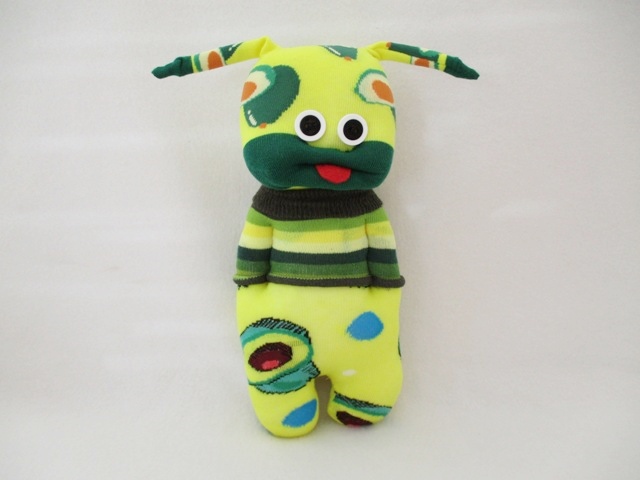 A unique funky soft toy, handmade from bright yellow socks with a sushi patter on them! FIDGET is wearing a little striped sweater, and has his hands in his pockets – a cool dude !