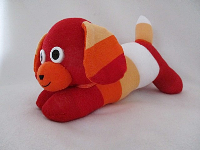Lovingly handmade from wide striped orange/white/red striped socks. Each puppy boasts a distinct personality, making it a one-of-a-kind gift for any dog enthusiast.