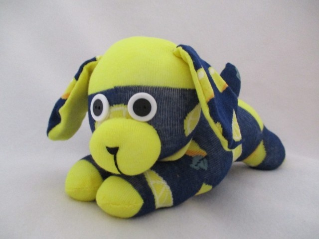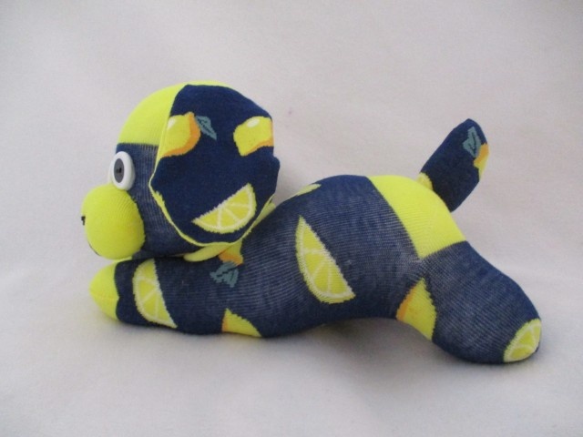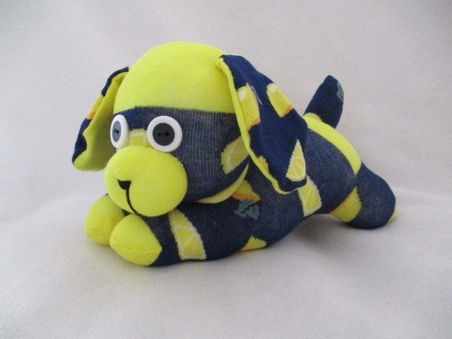 Lovingly made from navy socks with pictures of lemons on them. Each puppy is handmade with care ensuring everyone is truly unique. HARVEY isn’t just a toy, he-s a one-of-a-kind friend, bursting with character and charm.