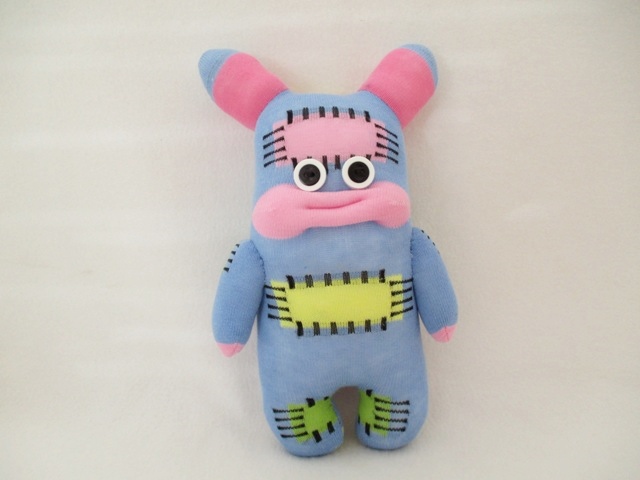 This ultimate quirky and colourful soft toy is made entirely by hand from blue socks with colourful patches on them.  HOAGIE has two little horns and is very friendly !