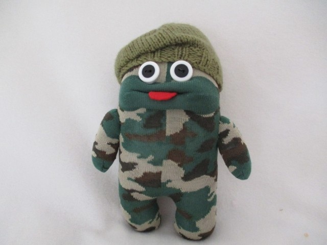Calling all recruits! This SOCKIE SOLDIER is ready to stand at attention and salute the most discerning military enthusiast. Meticulously handmade from camouflage socks and wearing a hand-knitted beret, this unique figure is a must-have for any army fan.