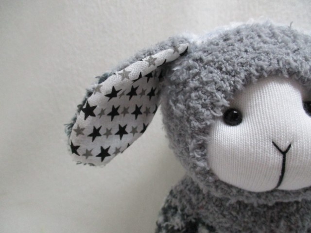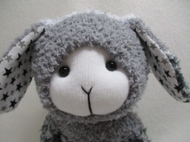 This fabulous cuddly toy is handmade from delightful soft grey/white socks. The ears are lined with a charming poly/cotton print fabric.  This adds a special touch.  An absolutely perfect soft toy for cozying up with on cold nights.