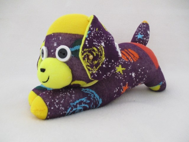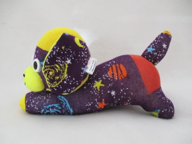 Made by hand from purple socks with a stars and planet pattern on them. This charming cute companion is UKCA approved and hand-washable. A delightful choice for parents seeking a reliable yet fun playmate for their little ones.