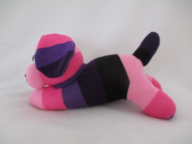 Made by hand from pink wide striped socks. This charming cute companion is UKCA approved and hand-washable. A delightful choice for parents seeking a reliable yet fun playmate for their little ones.