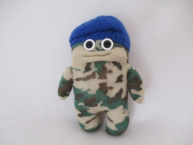 Meet the ARMY SOCK TOY, a fun blend of creativity and adventure made from camouflage socks to give it that military vibe. This adorable companion is perfect for any fan of the armed forces. MASON is wearing a stylish hand-knitted royal blue beret that adds a bit of character.