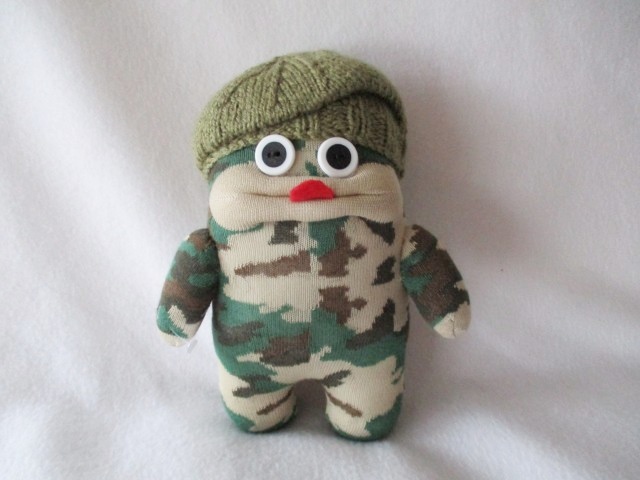Calling all recruits! This SOLDIER is ready to stand at attention and salute the most discerning military enthusiast. Meticulously handmade from camouflage socks and wearing a hand-knitted beret, this unique figure is a must-have for any army fan.