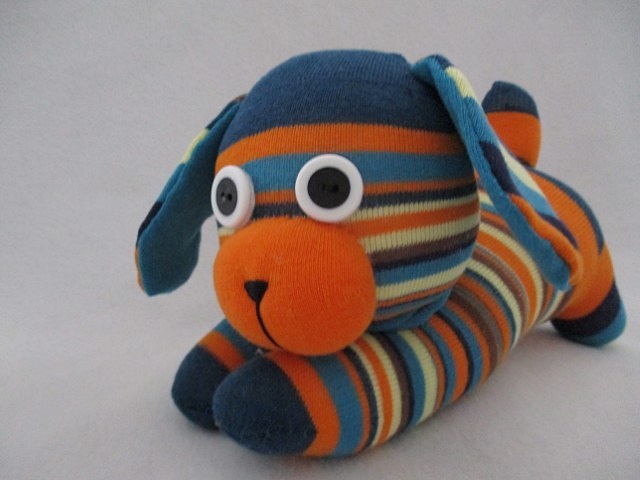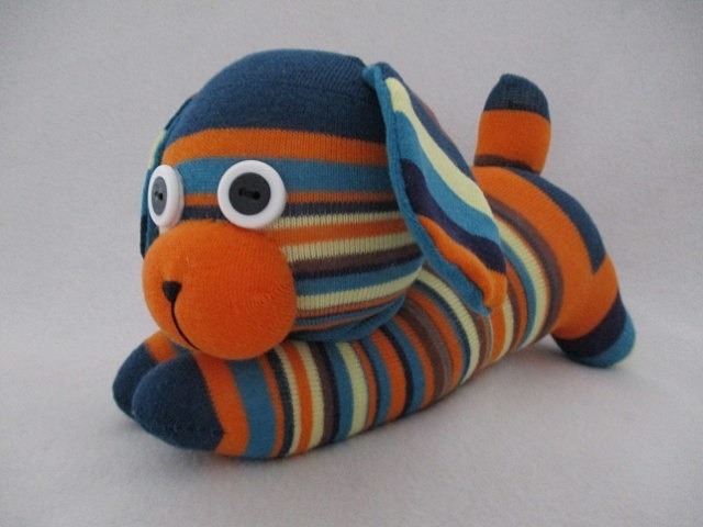 Lovingly handmade from orange/brown/cream/teal striped socks. Each puppy boasts a distinct personality, making it a one-of-a-kind gift for any dog enthusiast.