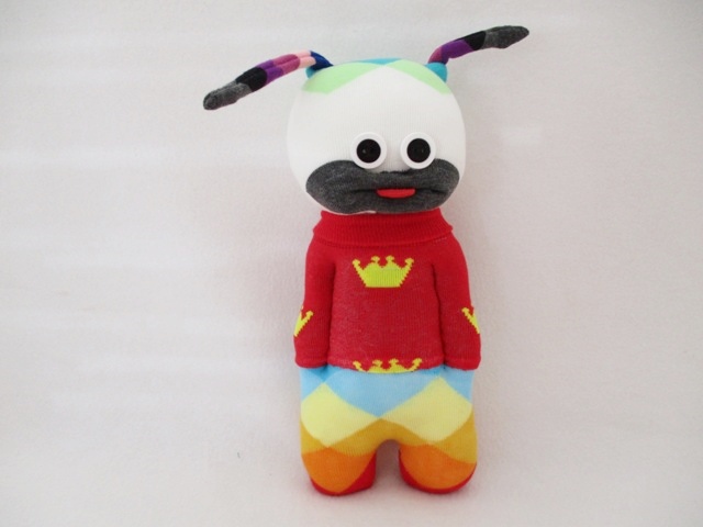 This unique funky soft toy is handmade from  bright diamond patterned socks. OKIE is also wearing a little sweater in red with yellow crowns on them.   What a great look !   His hands are stuffed in his pockets … !!