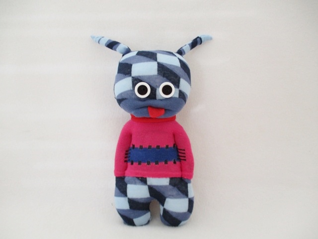 A new creation for this year. This unique funky soft toy is handmade from blue chequered socks. PEDLEY is wearing a little jumper in pink with patches, and has his hands in his pockets. What a great look !