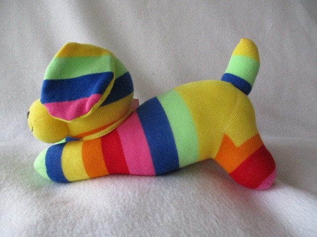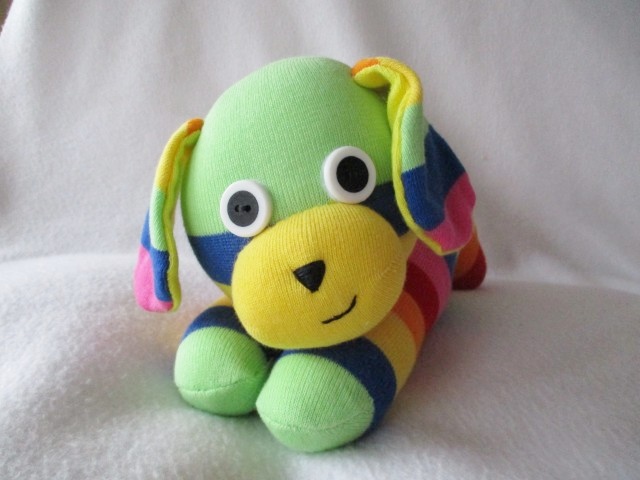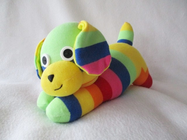 Lovingly handmade from rainbow striped socks. Each puppy boasts a distinct personality, making it a one-of-a-kind gift for any dog enthusiast.