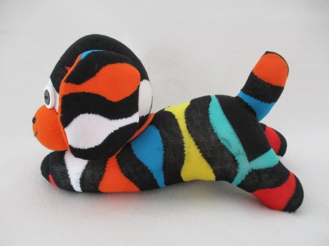 Introducing our adorable handmade Sock Puppy.  The perfect snuggly companion for dog lovers of all ages!  Crafted with love and care, this one-of-a-kind pup is not just any ordinary toy. RANGER is a delightful fusion of whimsy and warmth, made entirely from bright patterned socks.