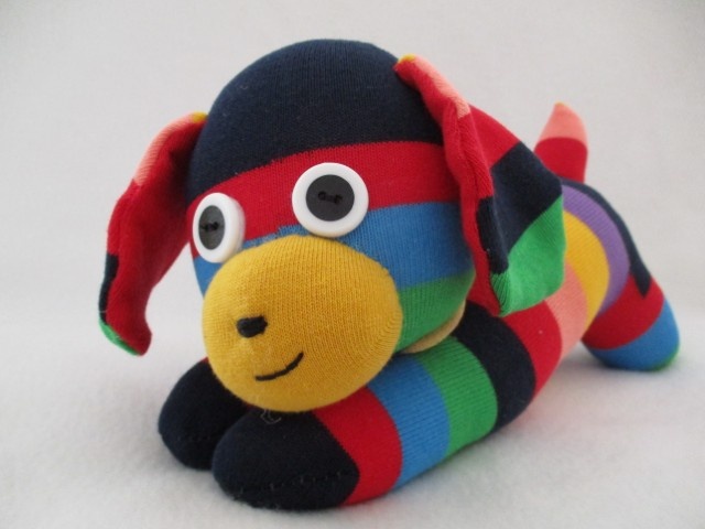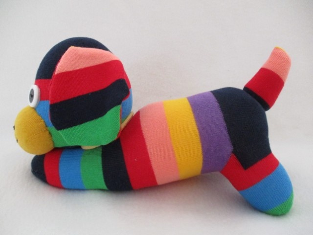 A wonderful handmade sock toy puppy. SHADOW is made from colourful wide striped socks. These have then been transformed into a one-of-a-kind toy.