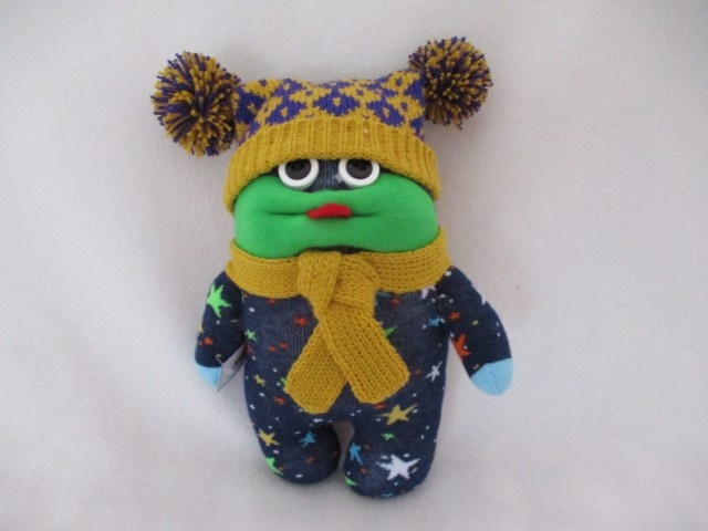 Presenting a truly unique and handmade gift crafted entirely from navy socks with colourful stars on them! This delightful creation dons a machine-knitted Fair Isle hat with two cheerful pom poms and a snug little scarf—so vibrant and colourful!