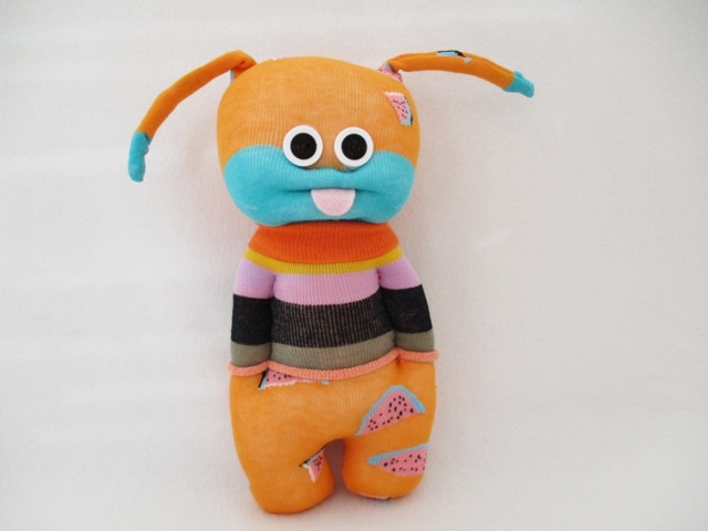 A unique funky soft toy, handmade from orange socks with little pictures of melon slices on them. SOLERO is also wearing a little striped sweater, and has his hands in his pockets for a cool look !