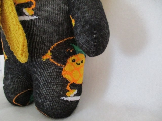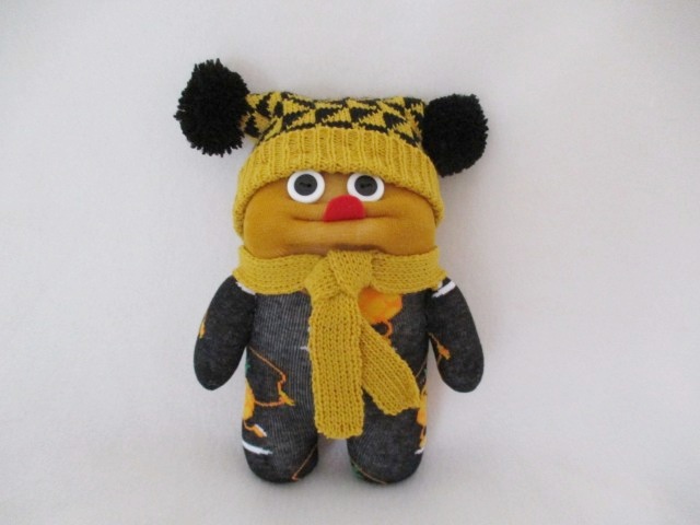 This ultimate quirky and colourful soft toy is made entirely by hand from black socks with little cartoon people skipping on them. The fair isle hat with two pom poms, and cosy scarf are machine knitted.