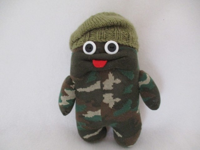 Salute this one-of-a-kind SOLDIER! Handmade from camouflage socks and wearing a hand-knitted khaki beret. A charming military figure that is the perfect gift for any army enthusiast. A unique, personalized gift for all military fans.
