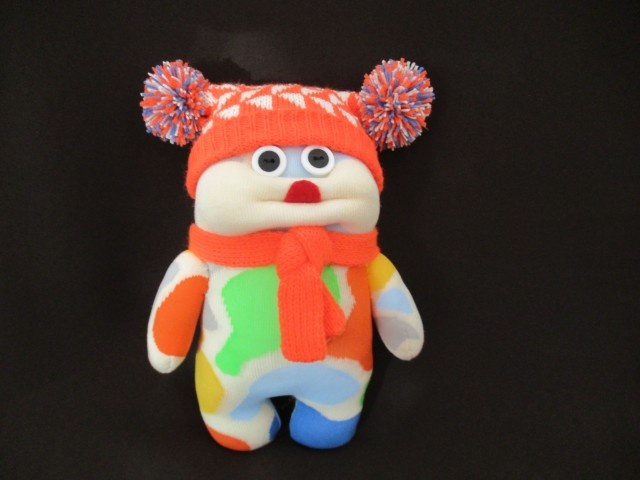 This handsome character is made from cream/orange/pale blue/yellow patterned socks. The perfect addition to any soft toy collection. The hat and scarf are machine knitting keeping him cosy at all times.